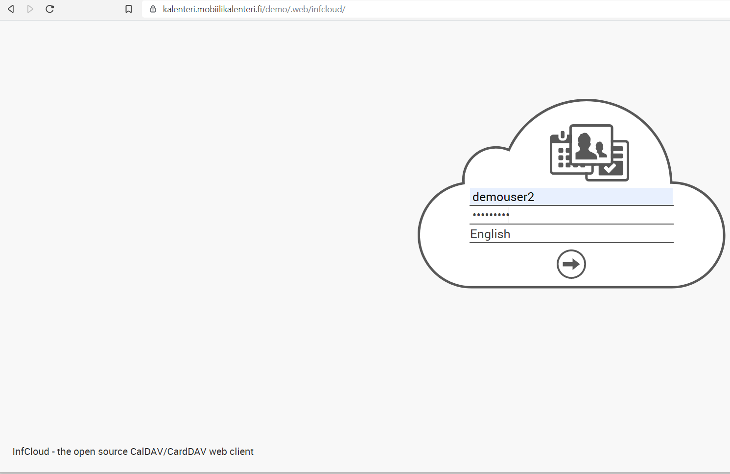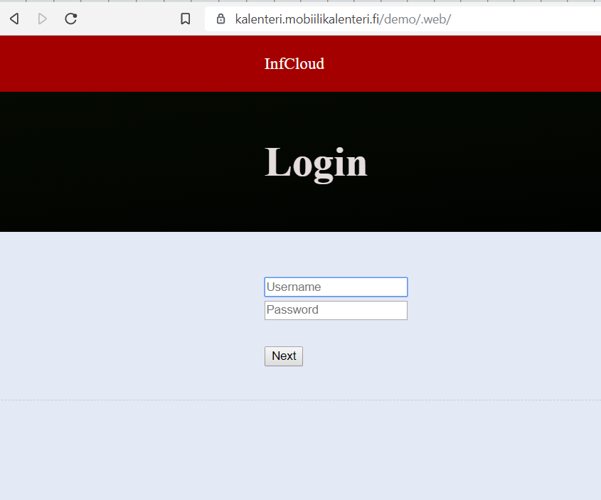 Alla kuvakaappaus Infcloudin kirjautumissivusta, johon pääsee edellä