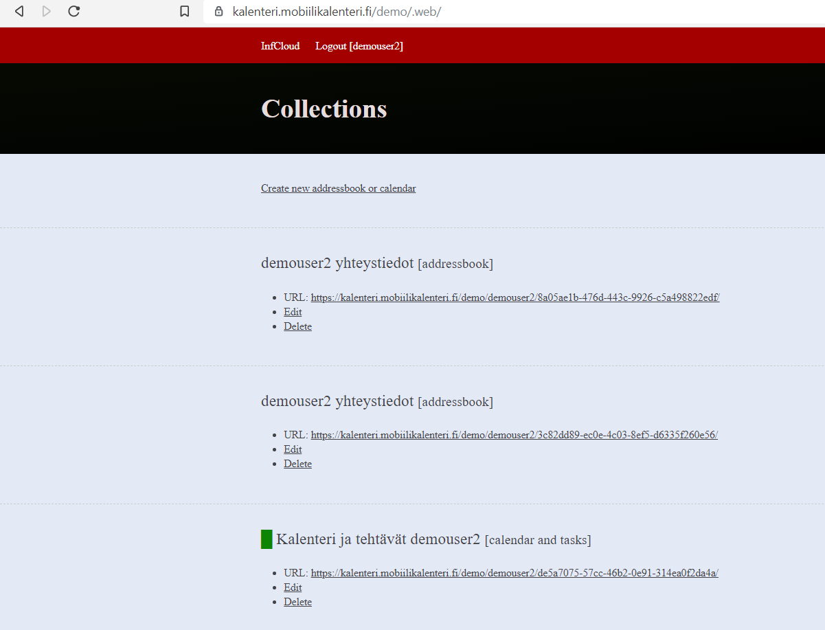 Jotkin edellä mainituista ohjelmista eivät tue uuden kalenterin tai osoitekirjan luomista. Siinä tapauksessa voit käyttää hallintapaneelia Web-sivulta suoraan hallitaksesi (uusien luonti ja vanhojen poistaminen) kalentereita ja osoitekirjoja.